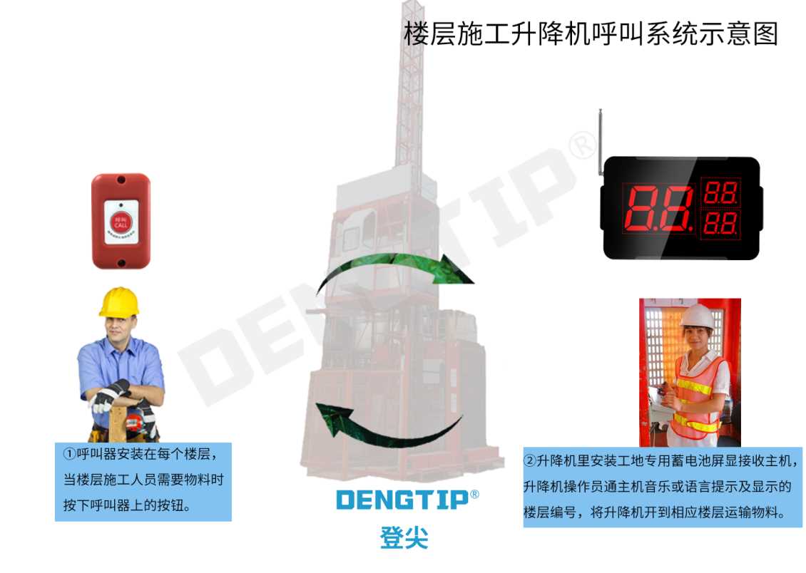 本套方案由工地专用呼叫分机和工地专用接收主机构成。在每个楼层安装分机,升降机里安装主机,当施工人员需要物料时,按下相应楼层的分机按钮,主机收到信息,升降机操作员开到相应楼层运输物料。
